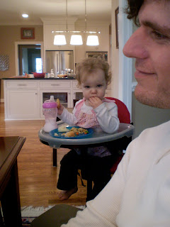 Love this outfit: Pre-dinner show at our apartment. Halle sports a felt lunch bag on her head and Rem's shoe on her foot. Remy (again in the background) is relaxing in a diaper box. That's normal, right?